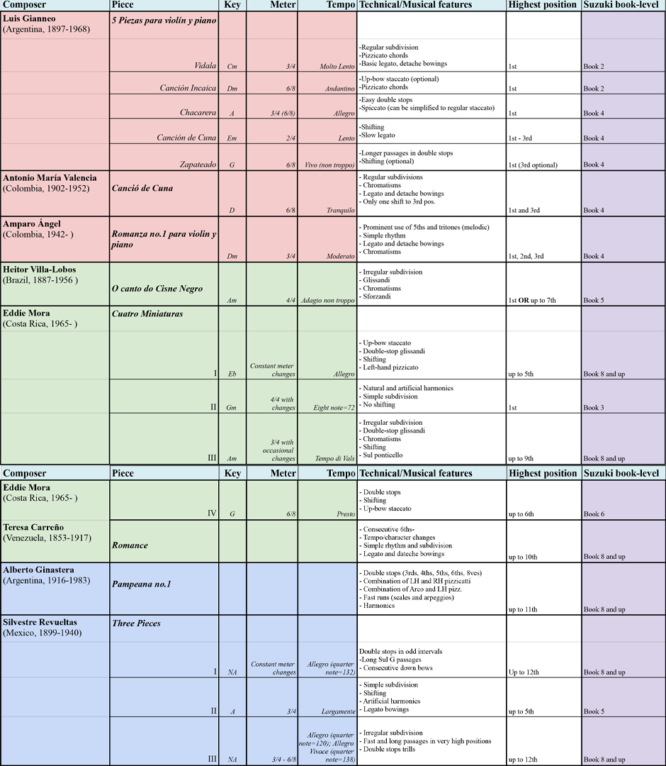 Repertoire sequences have evolved from a collection of technical studies into a comprehensive educational framework. This research aims to enhance the integration of innovative pedagogical materials by identifying, analyzing, and categorizing works originally composed for violin by Latin American composers. These works are assessed for their suitability within a structured violin curriculum and organized into graded levels, ranging from elementary to advanced.